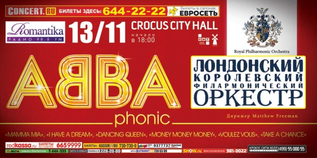 На этом осеннем концерте знаменитый британский оркестр под управлением Мэтью Фримана представит свою новую программу «ABBAphonic», презентация которой с успехом прошла в мае 2011 г в Лондонском Альберт Холле. В программу включены симфонические версии хитов, ставших символом эпохи диско, свободы и юности – композиции группы ABBA, среди которых: «Mamma Mia», «I Have a Dream», «Dancing Queen», «Money Money Money», «Voulez Vous», «Take a Chance» и много других.